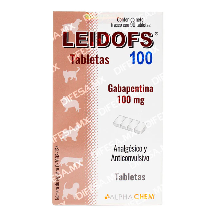 Leidofs 100 mg (Gabapentina) es un medicamento de la línea Alphachem diseñado específicamente para pequeñas especies. Actúa como analgésico neuromodulador, modulando la transmisión del dolor a nivel del sistema nervioso central, y como anticonvulsivo en tratamientos coadyuvantes de epilepsia y otros trastornos convulsivos. :contentReference[oaicite:1]{index=1}