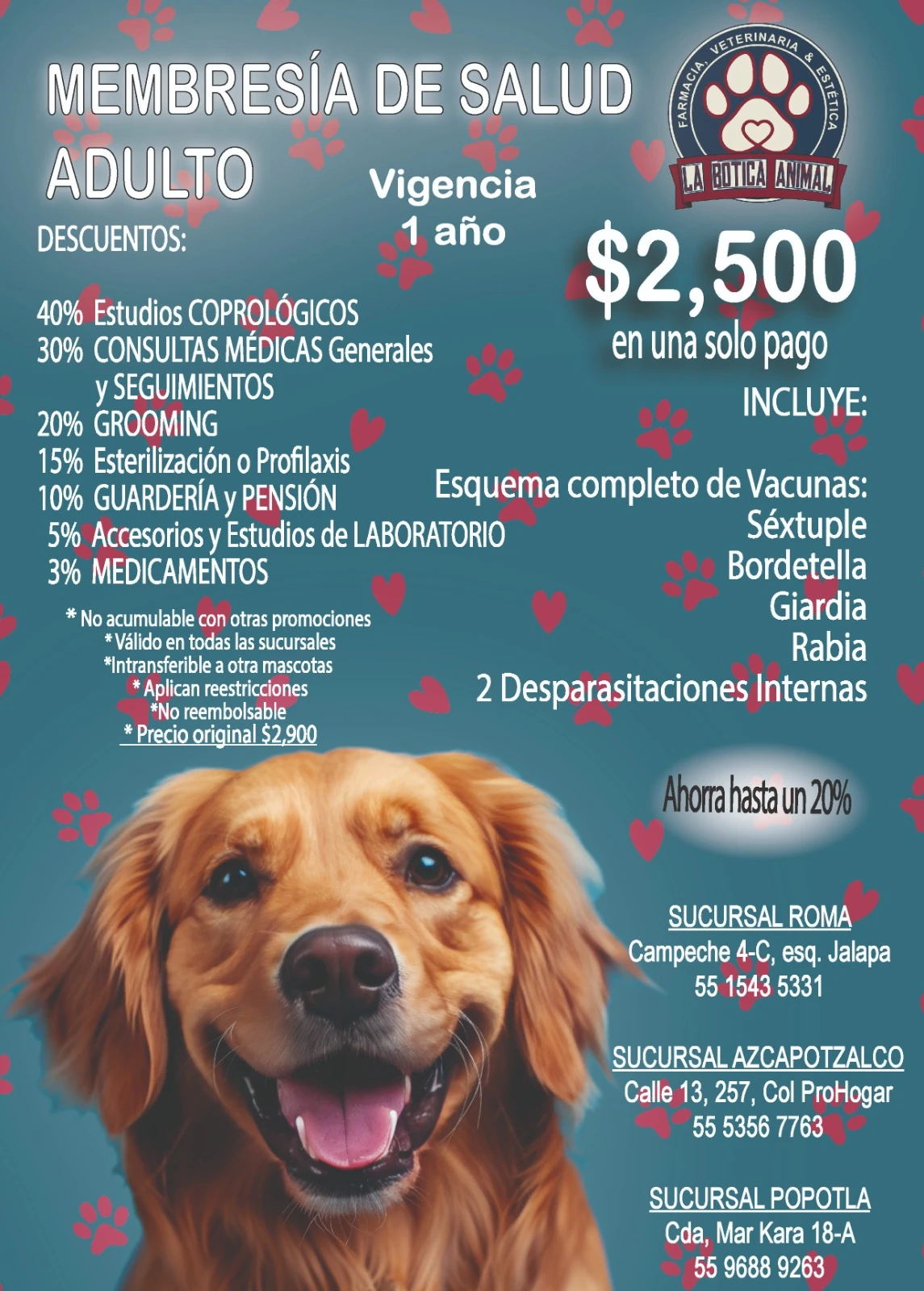 Nuestra Membresía de Salud Perro Adulto, es el producto que hemos creado en La Botica Animal pensando en mantener sano y fuerte el sistema inmune de nuestros amigos peludos y que estén siempre listos para la acción en cualquier momento, eso sí protegiéndose y protegiendo a otros amigos peludos de las enfermedades más comunes.